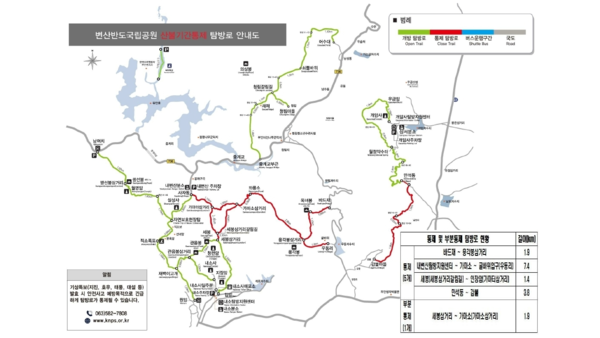 그 외 탐방로 10개 구간 35.575km는 평소와 같이 개방하므로 산행을 계획하는 탐방객들은 국립공원공단 홈페이지 탐방로 통제정보 및 공원사무소 측에 통제구간 확인이 필요하다.